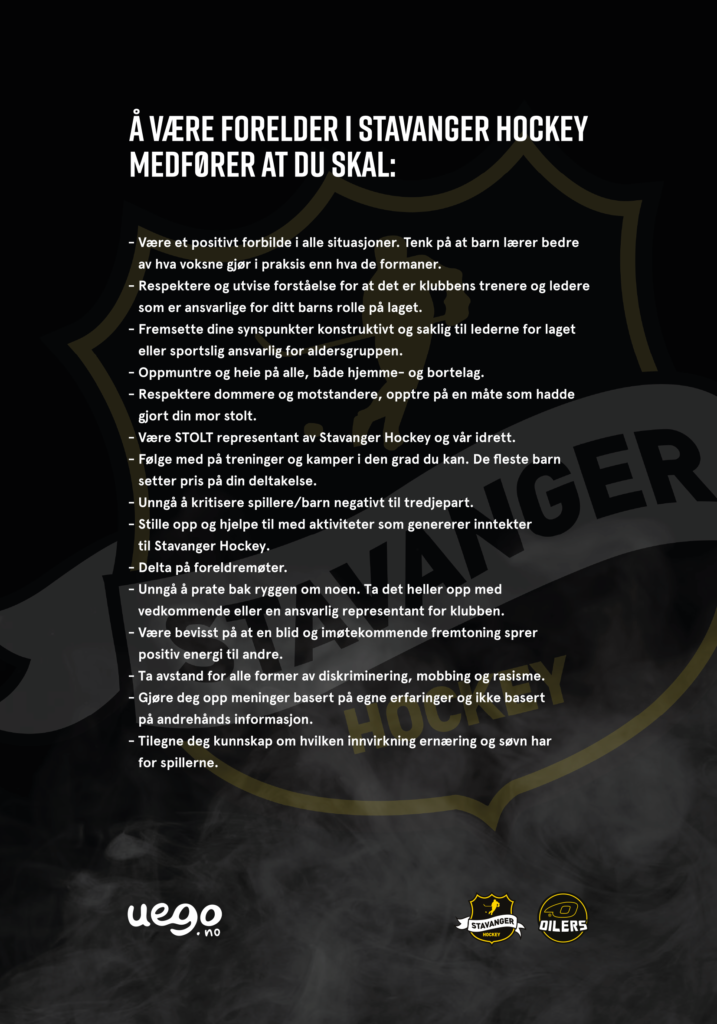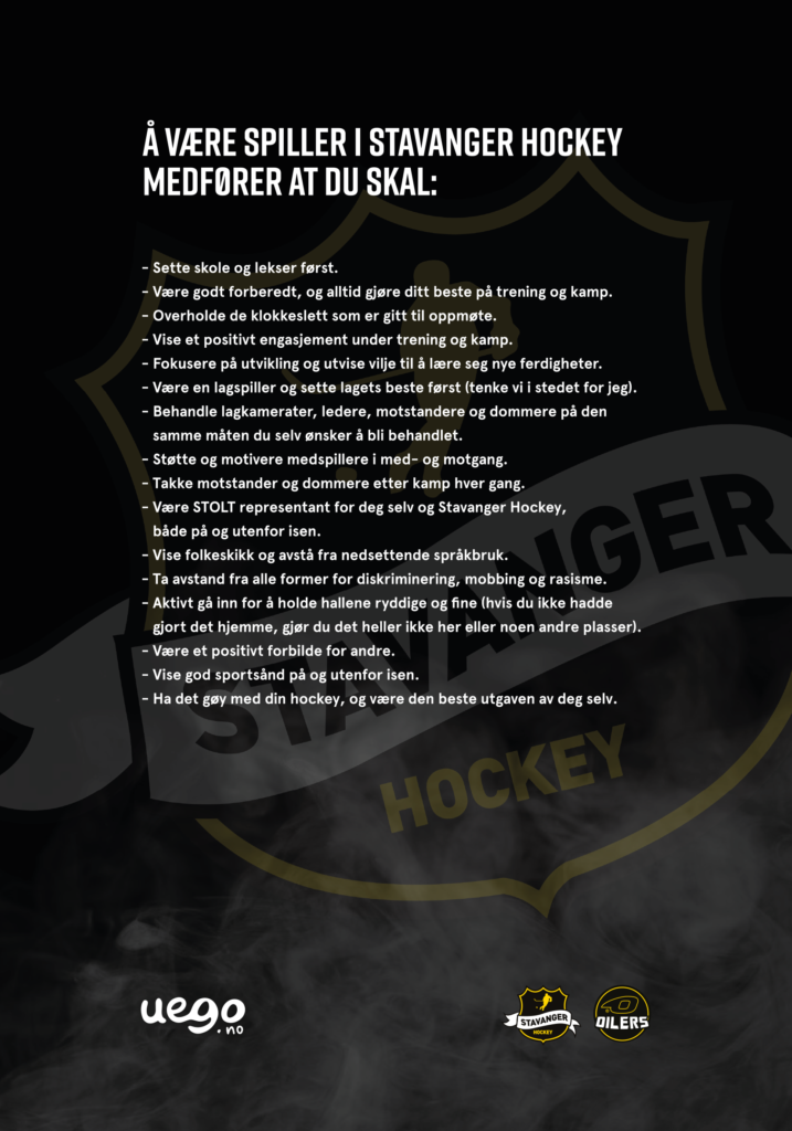 Stavanger Hockey anbefaler alle om å ta seg tid til å lese gjennom dette med jevne mellomrom, og ikke minst etterleve punktene i praksis. Er alle med på dette, vil ishallene bli et trygt og hyggelig sted å være for alle!