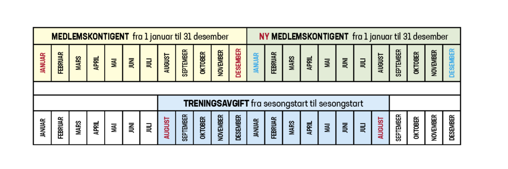 Treningsavgiften for aldersbestemte lag (med unntak av G/JU7) blir delt i 2 utbetalinger, en i august/september og en i januar. Øvrige grupper/aktiviteter blir fakturert ved oppstart, eller fortløpende etter påmelding.